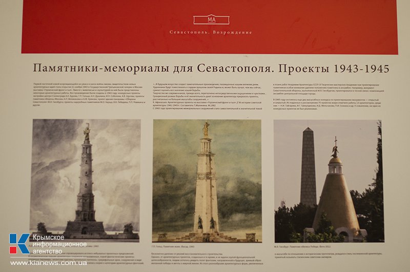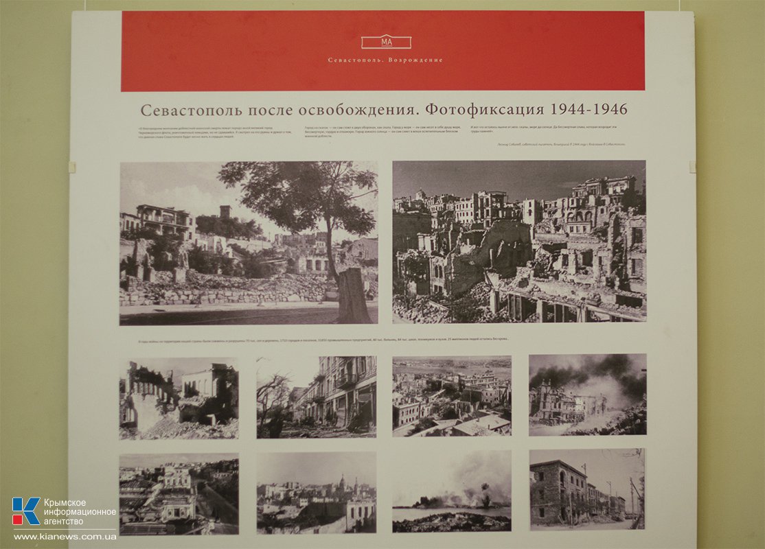 На выставке представлены фотографии Севастополя разных лет, а также неосуществленные проекты восстановления города, над которыми в то время работали известные архитекторы – Моисей Гинзбург, Григорий Бархин. Все материалы из своих фондов для выставки предоставил Государственный научно-исследовательский музей архитектуры им. Щусева. «Самое символичное и самый сильный архитектурный опыт – это история восстановления Севастополя, который был сметен с лица земли. В наших архивных фотографиях мы видим чудовищные руины послевоенного Севастополя. А сейчас мы приехали в город – и это красивейший город России, один из самых красивых», – говорит директор музея Ирина Коробьина.