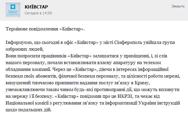 Как сообщает компания «Киевстар» на своей странице в социальной сети в контакте, сегодня в офис компании Киевстар в городе Симферополе зашла группа вооружённых людей. Они попросили работников «Киевстар» покинуть помещение, и со слов персонала компании «Киевстар», начали устанавливать своё оборудование на телекоммуникационное оборудование компании. В связи с этим, «Киевстар», действуя в интересах информационной безопасности своих абонентов, физической безопасности персонала и целостности работы сети, вынуждены были временно прекратить предоставление услуг связи в Крыму, делая, таким образом, невозможными противоправные действия, которые могут повлиять на сеть и её безопасность. «Киевстар» сообщил об этом НКРЗ и ожидает от комиссии инструкций по поводу дальнейших действий.