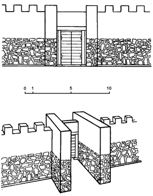 B районе центральных ворот оборонительная стена сохраняла увенчанную зубцами сырцовую надстройку, вероятно, с бойницами. За ней находилась довольно широкая боевая площадка для защитников города. Каменный пояс стены мог подниматься на высоту 4,5- 5 м, сырцовая же надстройка толщиной 1,5 м возвышалась вместе с зубцами на 3 м. Таким образом, общая высота стены на этом участке достигала, по-видимому, 8м.
