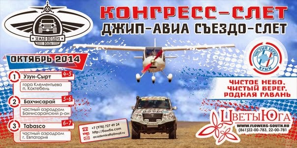 4-5-6-7-8 октября 2014 года на территории Республики Крым состоится ежегодный международный III Джип-Авиа Съездо-Слёт «Земля-Воздух-Вода 2014”. Основа мероприятия: это взаимодействие авиаторов, джиперов и владельцев водной техники, это живое общение, технические консультации, совместные полеты, поездки, морские прогулки с элементами обучения, и конечно, обзорные экскурсии, где будет возможность увидеть красоты Крыма изнутри, с высоты птичьего полета, и с морского горизонта.