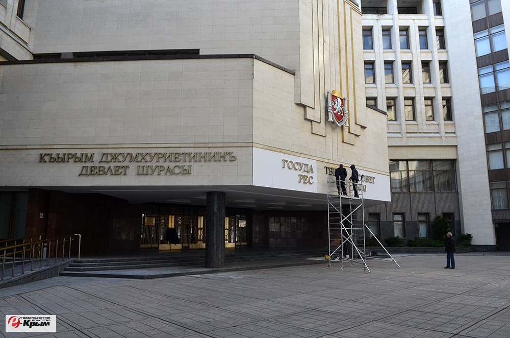 До марта прошлого года на здании также на трех языках было обозначено название Верховной Рады Крыма. Весной крымский парламент получил новое название, которое было обозначено на фасаде на русском языке. Спустя почти год на фасаде добавились соответствующие надписи на украинском и крымскотатарском языках.