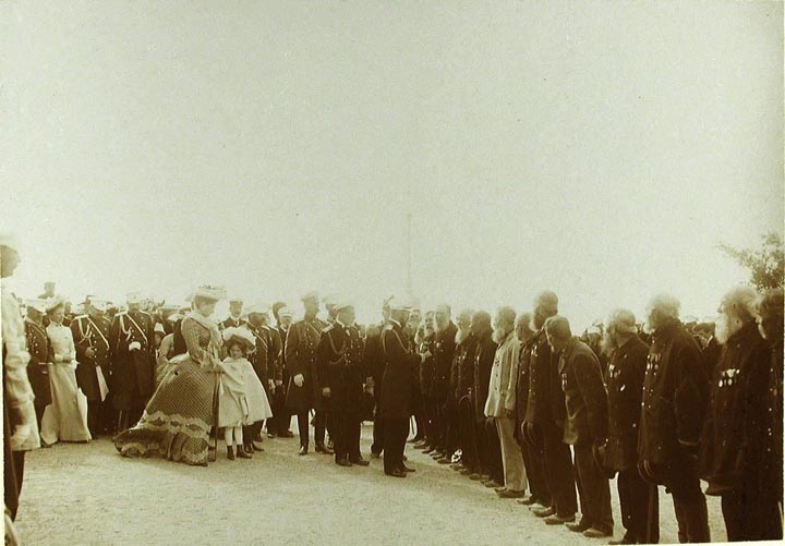 Император Николай II, императрица Александра Федоровна, великая княжна Ольга Николаевна приветствуют группу севастопольцев-ветеранов, участников Крымской войны.
