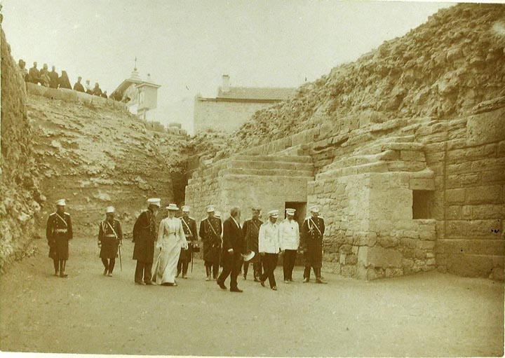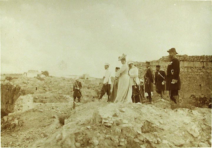 Император Николай II, императрица Александра Федоровна и сопровождающие их лица за осмотром развалин древней херсонесской крепости.