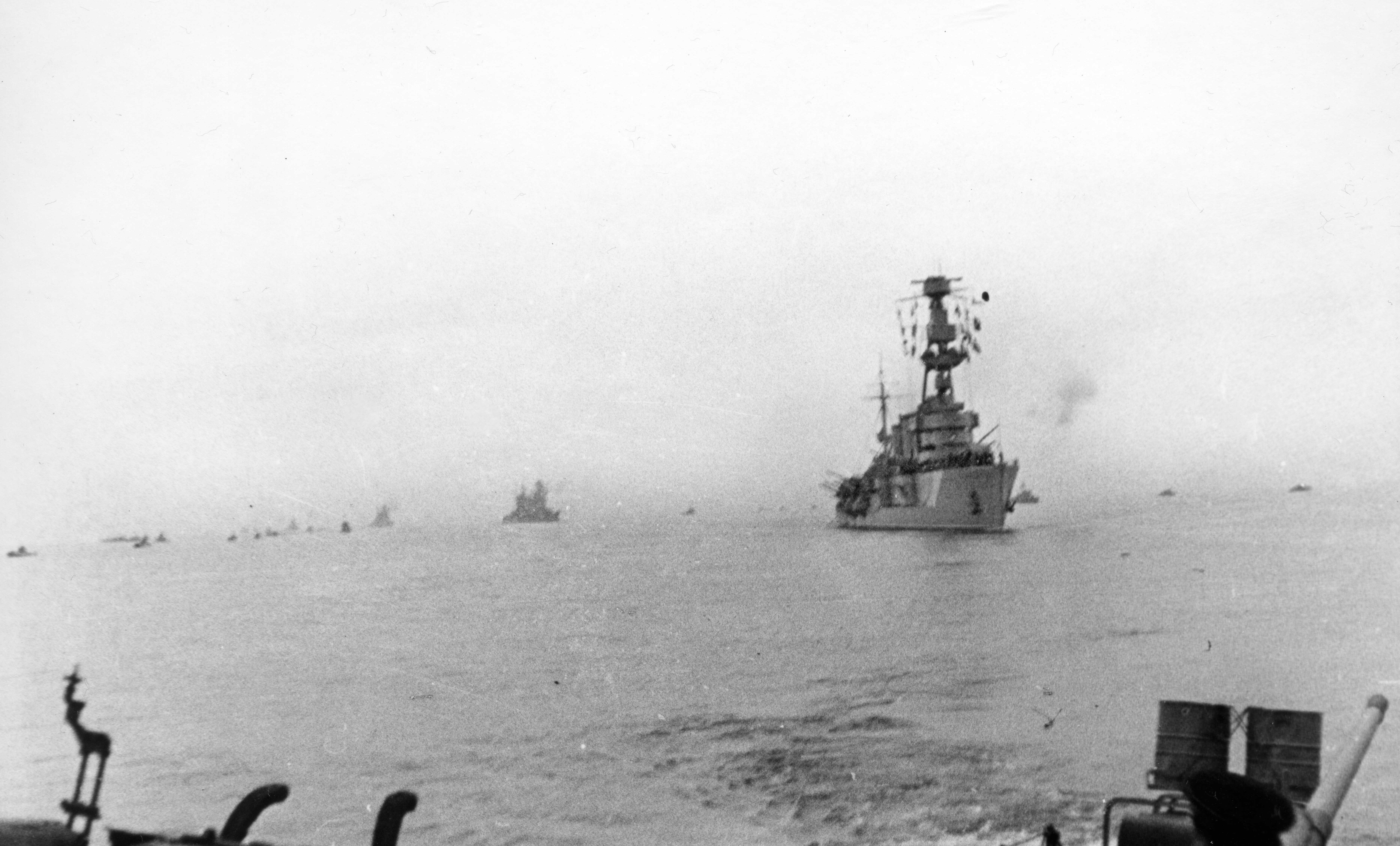 Черноморская эскадра возвращается в освобожденный Севастополь. На переднем плане — гвардейский легкий крейсер «Красный Крым», за ним виден силуэт линкора «Севастополь». 05.11.1944 г.