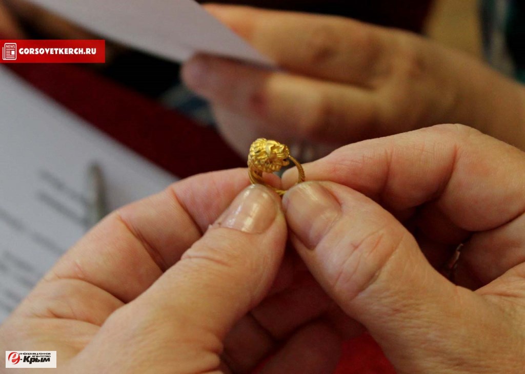 Массивная витая золотая серьга украшена головой льва. По мнению исследователей, она создана древнегреческими мастерами раннего эллинского периода. Это первая столь ценная находка археологического сезона 2015 года в Восточном Крыму.