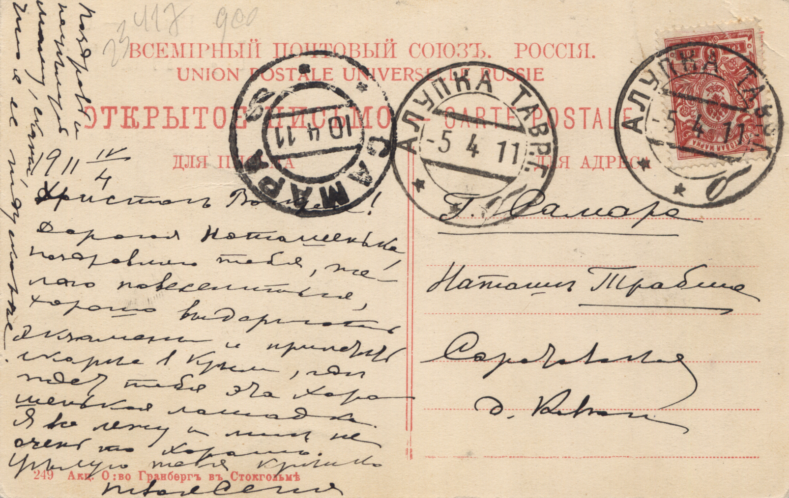 - Тип проводника в Ялте. Крым. Всемирный почтовый союз. Россия. №249. Акц. общ-во Гранберг в Стокгольме. Оборотная сторона