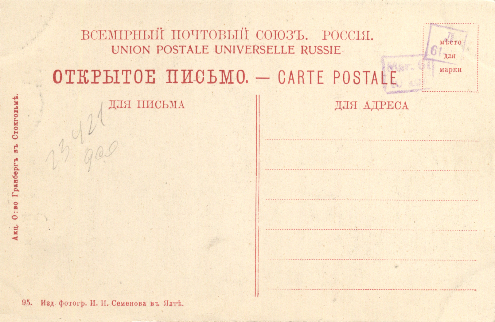 - Типы Татар. Крым. Всемирный почтовый союз. Россия. Акц. общ-во Гранберг в Стокгольме. №95 Изд. фотографа И.И. Семенова в Ялте. Оборотная сторона