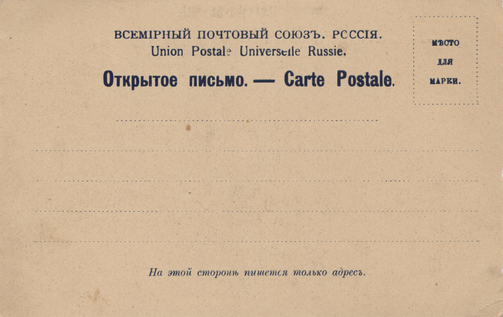 - Балаган близ пиндикюля. Всемирный почтовый союз. Россия. Фототипия Шерер, Набгольц и Ко, Москва, 1902 г. Оборотная сторона