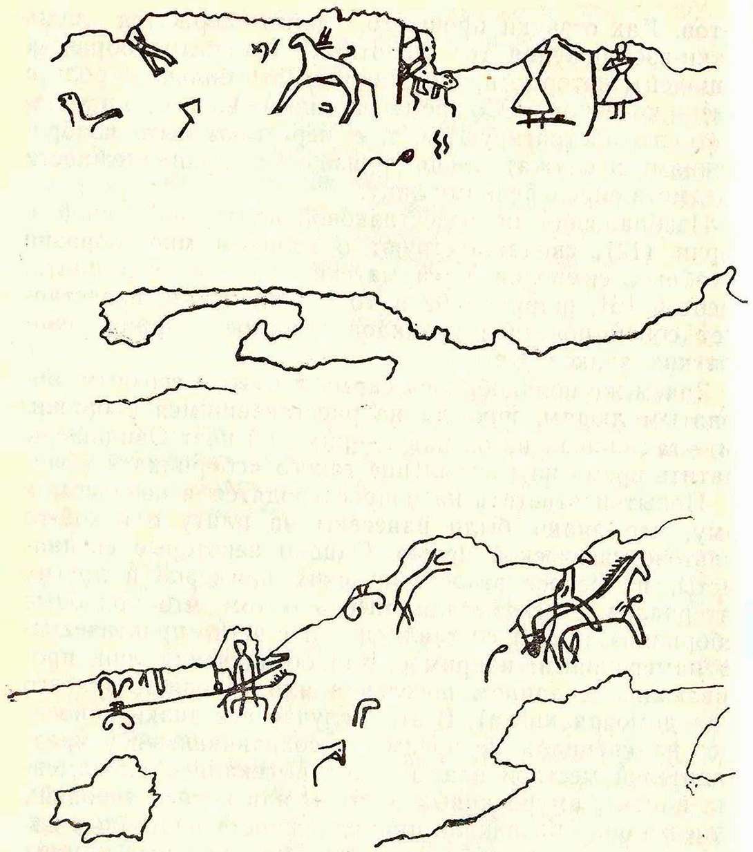 Впрочем, как бы ни решился этот спорный вопрос, для нас важно одно: кеми-обинцы при помощи красок, резцов, отбойников весьма искусно запечатлели на камне различные события из своей жизни. Не умея письменно закреплять звуки речи, они научились передавать информацию об окружающем их мире посредством «картинописи», или, как говорят ученые, пиктографии. Образцы этих «письмен» (пиктограмм), дошедшие до нашего времени, представляют собой своеобразные повествования в рисунках. Остановимся подробнее на некоторых из них.