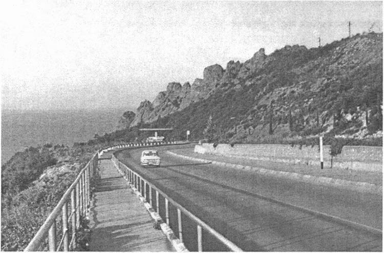 Но и этих поворотов оказалось мало; необходимо было прорвать внутренность утеса, совершенно заграждавшего дорогу, и теперь вы, еще в виду Байдарских ворот, проезжаете черною дырою туннеля. За нею берег поворачивает, и начинаются другие виды. Бесспорно, это живописнейшие места Южного берега».