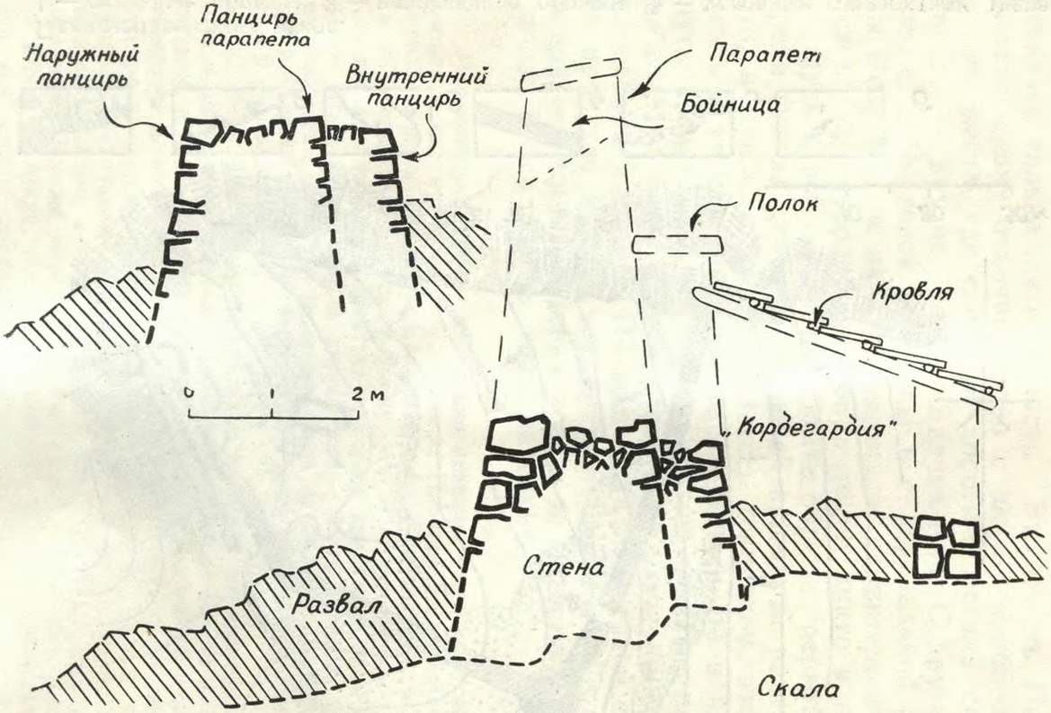 Торопиться и не стоит. Поднимаясь без спешки, замечаешь многие немаловажные подробности: крепиды дороги, остатки боковых стен и, пожалуй, самое интересное — что на всем протяжении, вплоть до входа в ущелье, дорога была, несомненно, проезжей, во всяком случае доступной для проезда небольших двухколесных повозок. Ее ширина почти везде больше 1,5 м. Крутые повороты вправо и влево удлиняют путь, но делают его в общем достаточно пологим. Кое-где на скальном основании, на плоских глыбах известняка, лежащих в полотне дороги, или на обнаженных сланцах заметны парные колеи. Значит, к Шайтан-Мердвену поднимались или во всяком случае спускались с него не только пешком, но и в повозках.