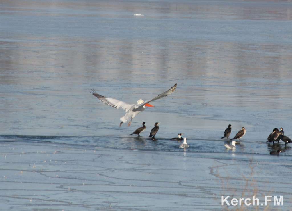 В Керчи в районе Молодежного пляжа зимует пеликан. Он держится уток и лебедей, которые переместились в это место для зимовки.