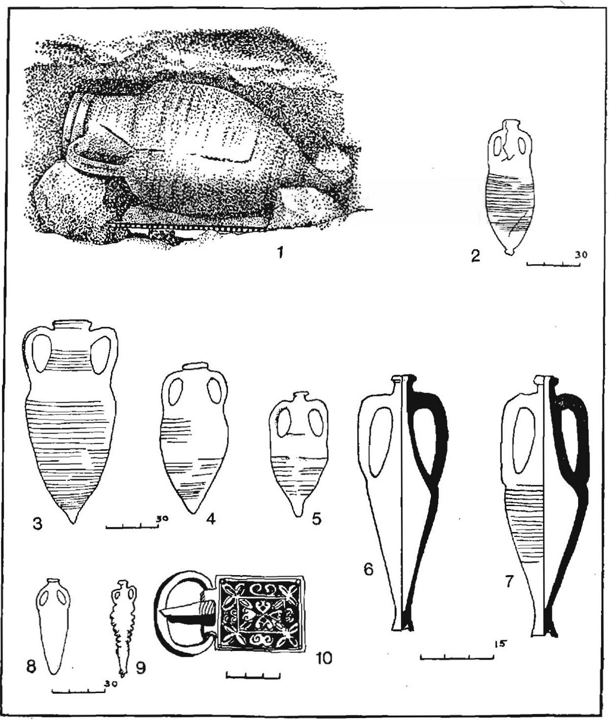 Большинство исследователей, которые занимались этим вопросом [265, с. 12; 277, с. 94; 182, с. 159—160; 183, с. 186—187; 185, с. 86—88; 371, с. 105], связывают разгром позднескифских городищ и селищ с походами племен готского союза в сер. III в. Именно этим временем датируются т. н. закрытые комплексы археологических находок из помещений внезапно разрушенных сооружений во время гибели позднескифских городищ Юго-Западного Крыма. Так, при исследовании городища Алма-Кермен обнаружен дом с фресками, построенный в период существования на Алма-Кермене римского военного лагеря, а затем используемый местными жителями для хозяйственных целей до последних дней существования городища. В комплексе вещей, найденных на полу помещения с фресками, кроме различных железных орудий, жерновов, лепных сосудов, присутствуют античные амфоры нескольких типов, датированных не позднее чем III в.: относительно большие красноглиняные амфоры с ребристым туловом и резко профилированными ручками (рис. 2, 1—3); небольшие амфоры из светлой глины с темными вкраплениями, расширяющимся горлом и слабым рифлением тулова (рис. 2, 4); фрагменты красноглиняных амфор с высоким суживающимся желобчатым горлом и приподнятыми кверху резко изогнутыми ручками (рис. 2, 5—6) [181, с. 187—188, рис. 7]. Здесь же обнаружены фрагментированные и целые краснолаковые сосуды, распространенные в III в.: четыре миски на кольцевом поддоне с резко профилированными, рельефными, загнутыми внутрь или наружу краями (рис. 2, 7—9); кувшинчики, фрагменты кубков (рис. 2, 10—14) [181, с. 189, рис. 8]. Ни одной находки, твердо датируемой IV в., в этом помещении не обнаружено. При исследовании Алма-Кермена в верхних слоях городища отмечены следы пожара, свидетельствующие об единовременной гибели большинства построек. На улицах найдены скелеты погибших жителей, которых уже некому было хоронить.