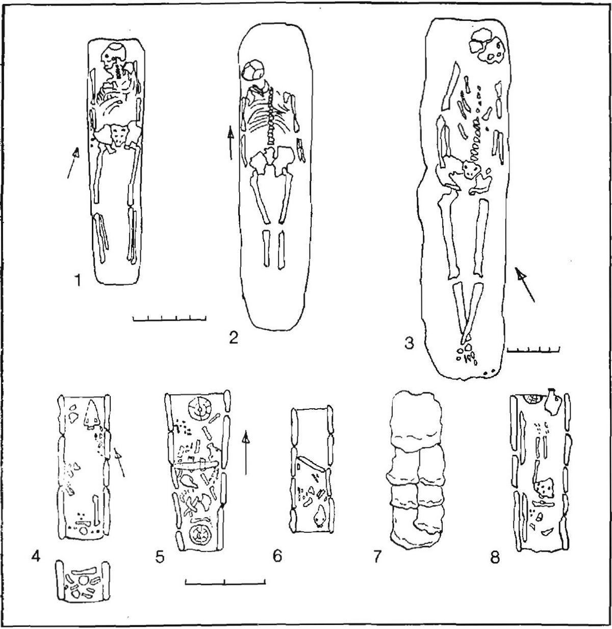 В настоящее время в Северном Причерноморье открыто более десятка могильников Черняховской культуры: Фурмановка вблизи дельты Дуная, Викторовка, Коблево, Ранжевое, Каменка, Каборга IV — на берегах Тиллигульского и Березанского лиманов, Городок — в низовьях Южного Буга, Большая Корениха и Чубовка — на правом берегу Бугского лимана и др. [442, с. 196—201; 443, с. 209—235; 445, с. 63—111; 317, с. 89—90; 318, с. 67—74; 319, с. 105—114; 320, с. 24—62; 203, с. 136—149; 194, с. 45—50; 195, с. 35—53]. В указанных могильниках преобладали трупоположения. При общем Черняховском облике материальной культуры, в типах погребальных конструкций этих захоронений и некоторых деталях обряда трупоположения отчетливо выделяются сарматские погребальные традиции. Могилы с заплечиками преобладали в Каменке (28 из 33), Ранжевом (10 из 19), Коблево (27 из 52), Викторовке (6 из 14); они отмечены также в Фурмановке (3 из 25) и Каборге (3 из 27). Подбойные могилы открыты в Фурмановке (8 из 25), Викторовке (9 из 14), Ранжевом (4 из 19), Коблево (9 из 52), Каборге (4 из 27), Каменке (3 из 33), Чубовке (1 из 4). Шесть подпрямоугольных и овальных в плане склепов (из 52 погребений) обнаружены в могильнике Коблево, два из 25 — в Фурмановке. Овальный в плане склеп зафиксирован также в могильнике Большая Корениха. Все перечисленные типы погребальных сооружений, включая прямоугольно-удлиненные и широкие подпрямоугольные ямы, в различных сочетаниях обнаружены в позднесарматских могильниках Нижнего Поволжья, Прикаспия, Волго-Донского Междуречья [416, с. 111; 410, с. 59—72; 336, с. 26—28].