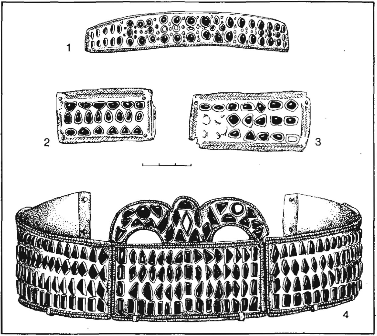 Рис. 7. Инкрустированные диадемы из гуннских погребений в Крыму: 1 — Марфовка (по Ю. Марти); 2—3 — Миролюбовка (по Т.Н. Высотской и Е.А. Черепановой); 4 — Керчь (Римско-германский музей. Кельн, ФРГ)