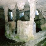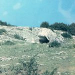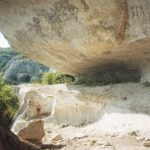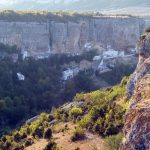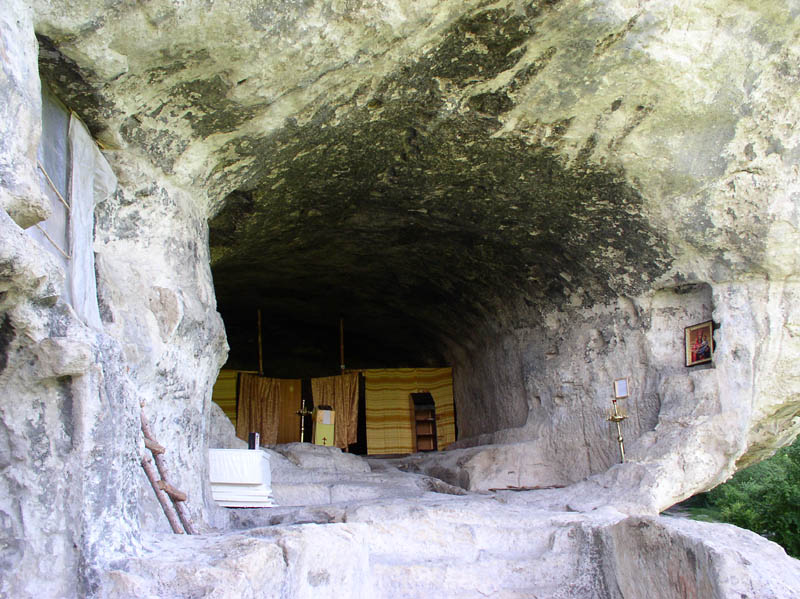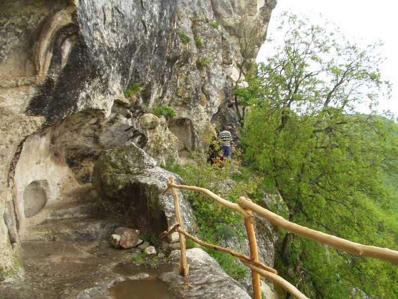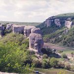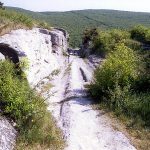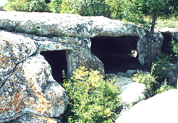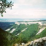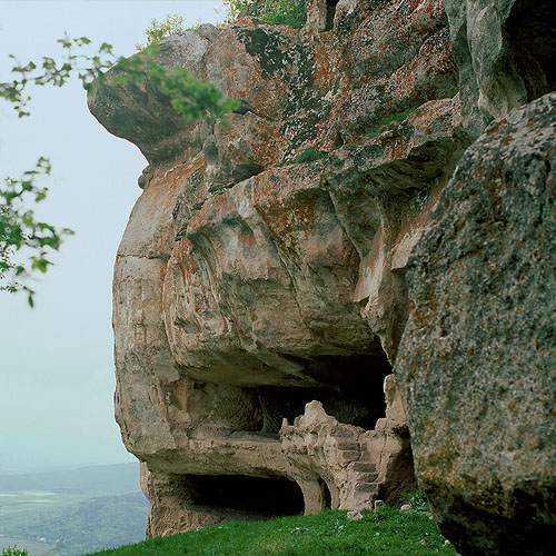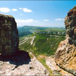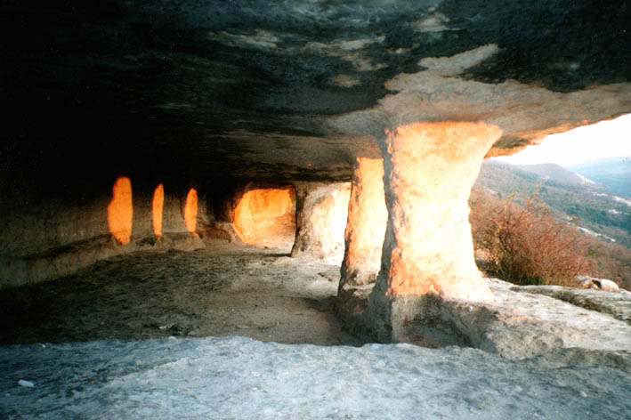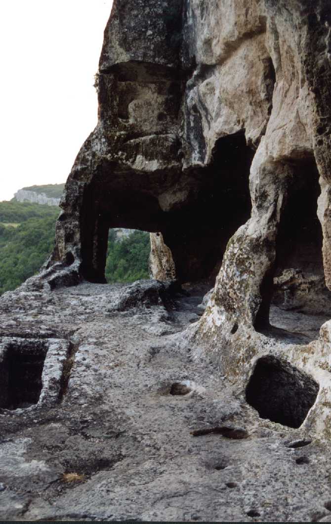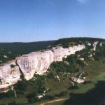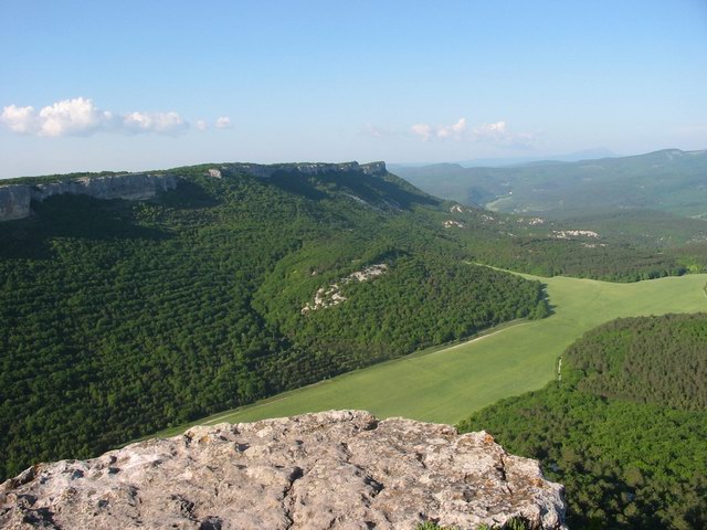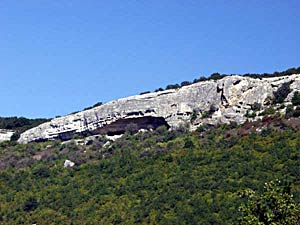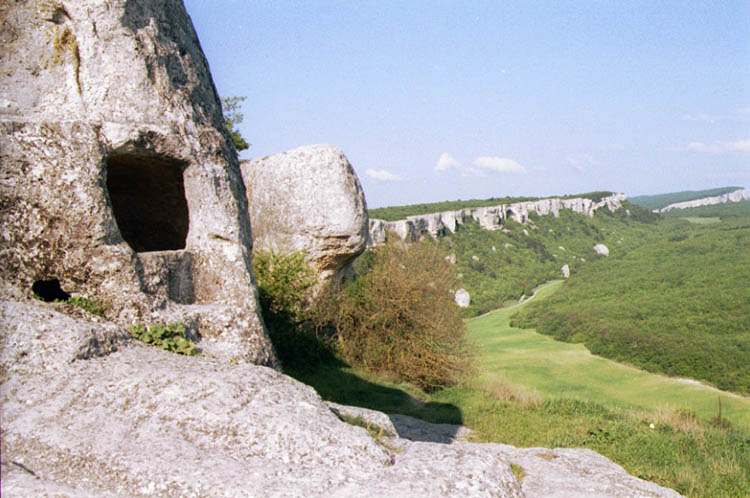 - Эски-Кермен, храм Донаторов. Внизу овраг Джан-Казы. Плоская гора вдалеке — Кая-Баш