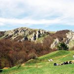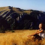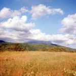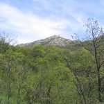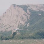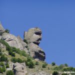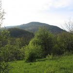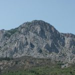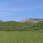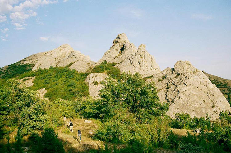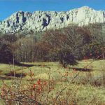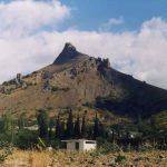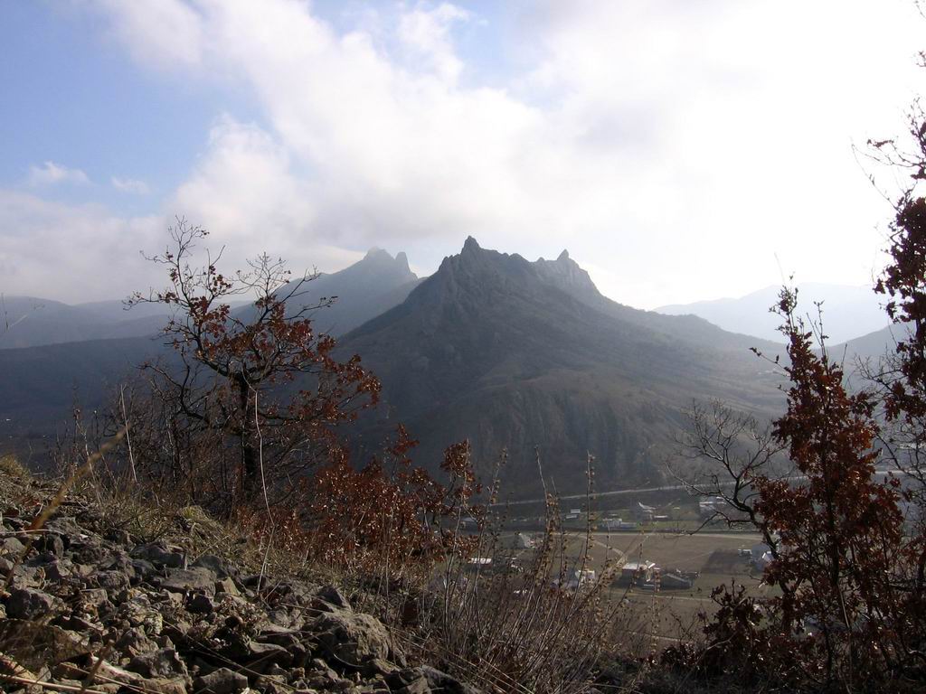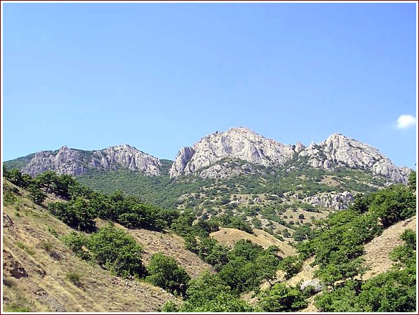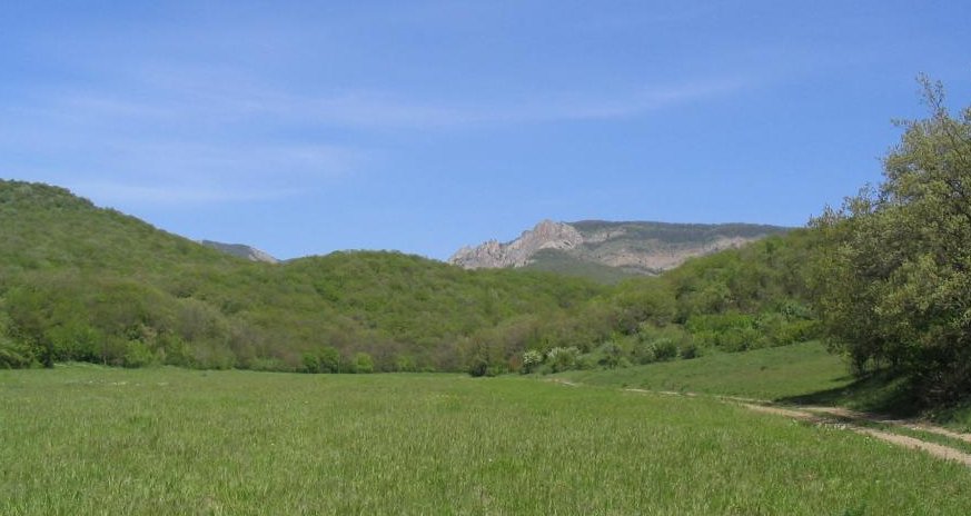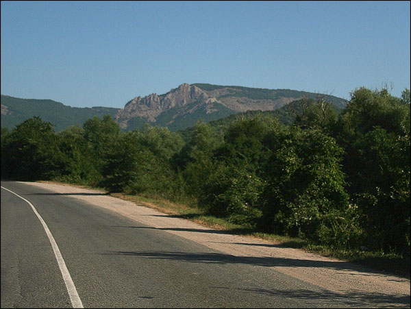 - К северу от Козы (Солнечной Долины). Слева — гора Чобан-Яклан-Кая. Справа, возможно, гора, освещенная солнцем со скалами у вершины — Теке-Атанг. Под ней, ближе, невысокая гора с террасированным склоном — Сююрю-Кая. Лето, 2006 г.