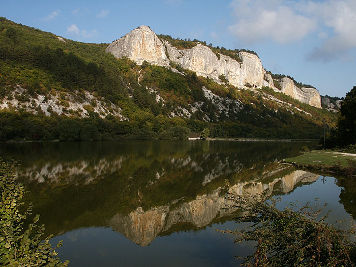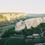 - Гора Тепе-Кермен. На ее вершине сохранились развалины одноименного пещерного города. В скальном выступе на вершине видны окна криптов (черные точки). Справа в горах различимы белые купола телескопов. Это известная крымская обсерватория в поселке Научный
