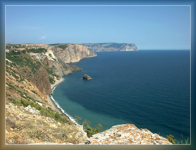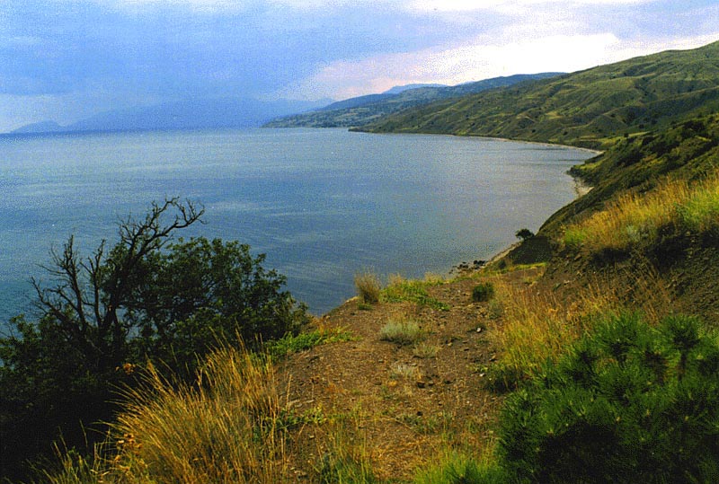 - Делилиманская бухта, гг. Тильки-Кая (вдали справа), Караул-Оба, мыс Чекан-Кая. Август, 2005.