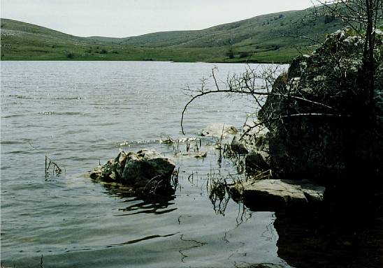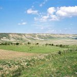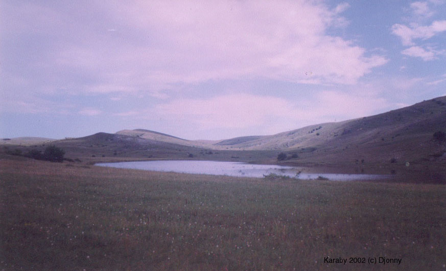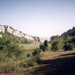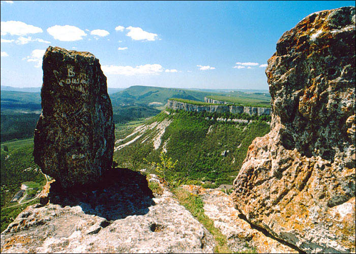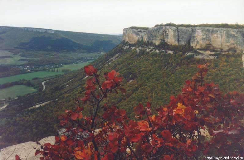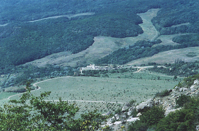 - Вид с плато Топшан на северную оконечность Эски-Кермен и долину Джан-Казы за ней. Август, 2002 г.