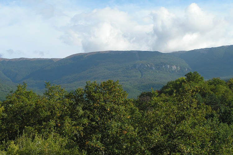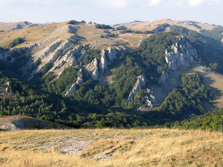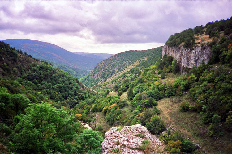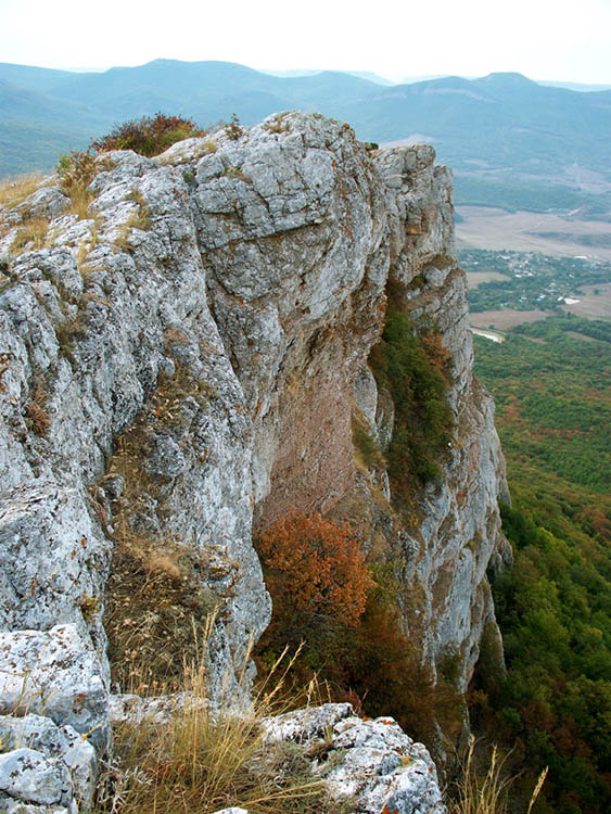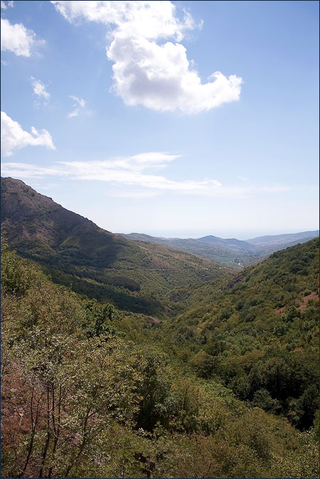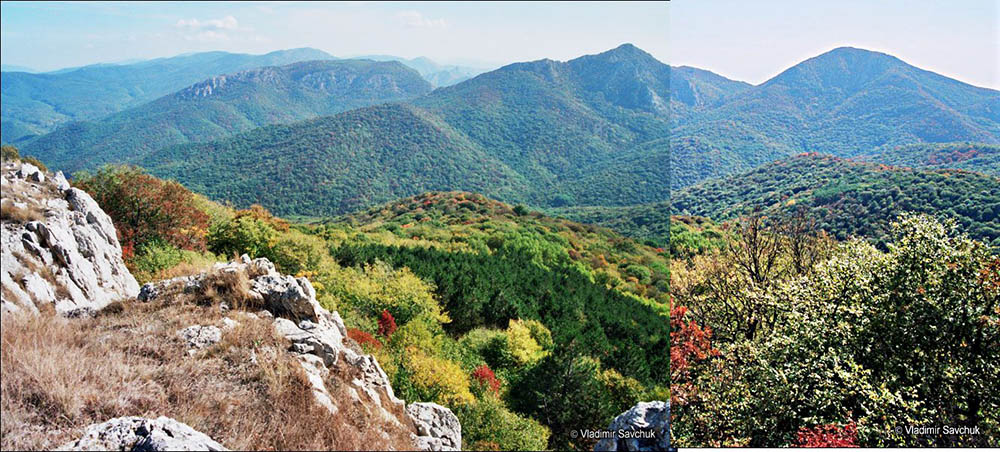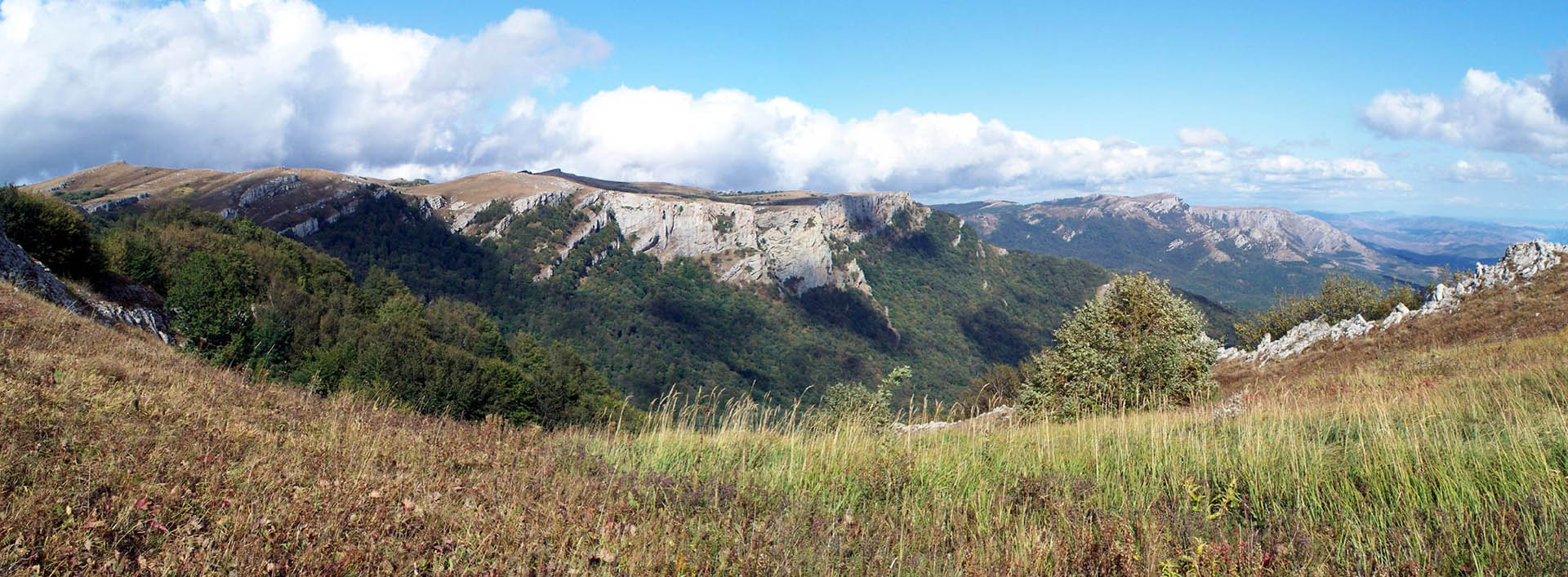 - Вид с горы Ялпах-Кая на долину реки Коккозки и гору Бойка с её южными скальными обрывами Буюка-Кая. Сентябрь, 2008.