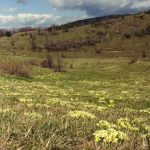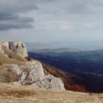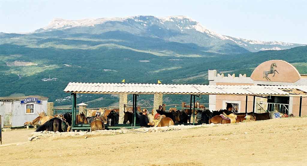 - Комм. Дмитрия Калинина, автора: «[Панорама] cнята с вершины 1286м северо-западнее самой Стол-Горы (общий вид на восток). Стол-Гора на снимке самая правая (ровное плато) она ниже этой вершины (1240м). Левее ее на горизонте горы Тай-Коба и Кара-Тау. За триангулятором и левее его панорма Караби, внизу долина р. Бурульча». Мой: Вост. окраина Тырке-яйлы. Вид с г. Долгая на восток. Справа Стол-Гора, левее и дальше волнистый хребет — Таш-Хабах. Вдали плато Караби-Яйла. Апрель 2003 г.