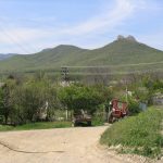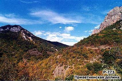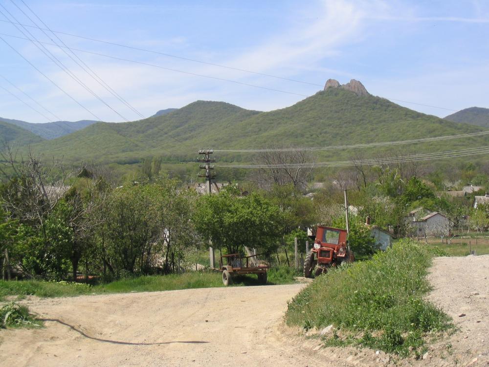 - Краснокаменка. Вдали — высокий хребет Эчки-Даг. Ближняя скалистая вершина на нём — Куш-Кая, за ней лесистая — Кара-Оба. 2005 г.