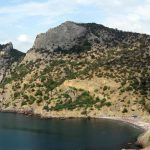 - Панорама берега Лисьей бухты. В центре (слева направо) вершины гор: Деламет-Кая, Ювез-Алан, Кокуш-Кая, Бакыр-Баш (последние три на хр. Эчки-Даг). Справа г.Ашламалык. Вдали справа — Кара-Даг, слева — Меганом.