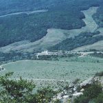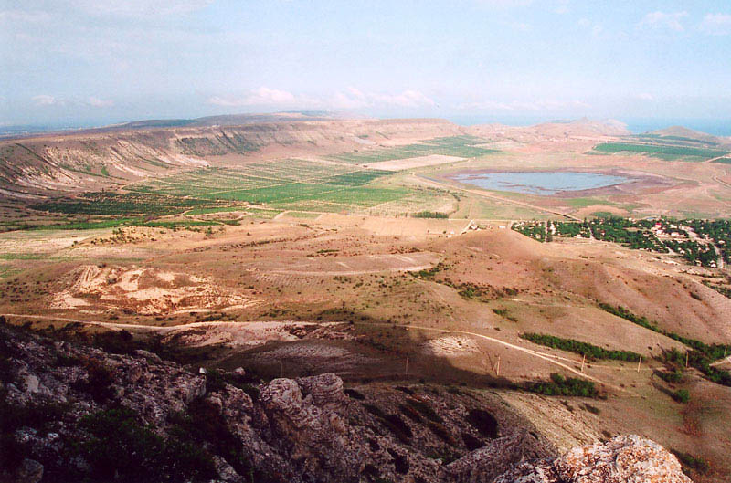 - Вид с северного склона хребта Таракташ на Судакскую долину. В центре снимка — возвышенность Айбатлы. Внизу — Дачное (Биюк-Таракташ). 2001 г.