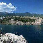 - На переднем плане — маленький хребет Эльтиген. Самой высокой вершиной которого является Деликли-Кая. На самом краю снимка — скала Сейран-Кая. Между ними, вдали, возможно, — гора Пандас-Кая.