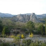 - «Выезд (на север) из Сол.Долины. Справа скалы хребта Чалки. В центре хр. Эльтиген, слева Парсук-Кая.». В.К. Хребет Эльтиген — это низкие скалы в центе снимка, прямо на продолжении дороги. Самая высокая из них — Деликли-Кая. Вероятно, напротив, остроконечная скала справа от дороги — Сейран-Кая.