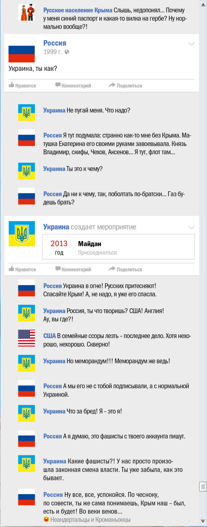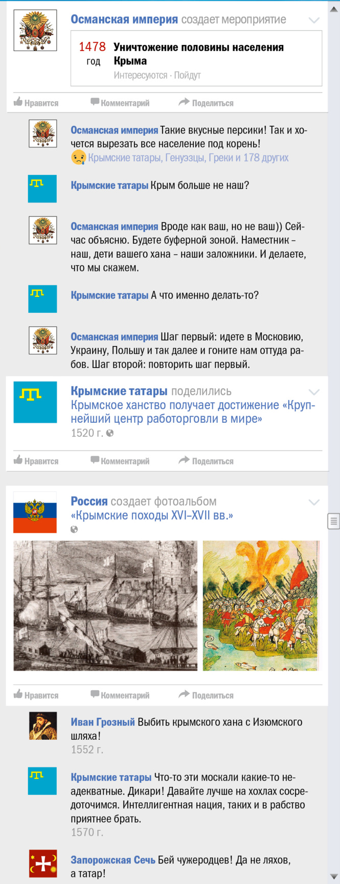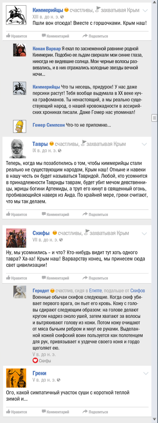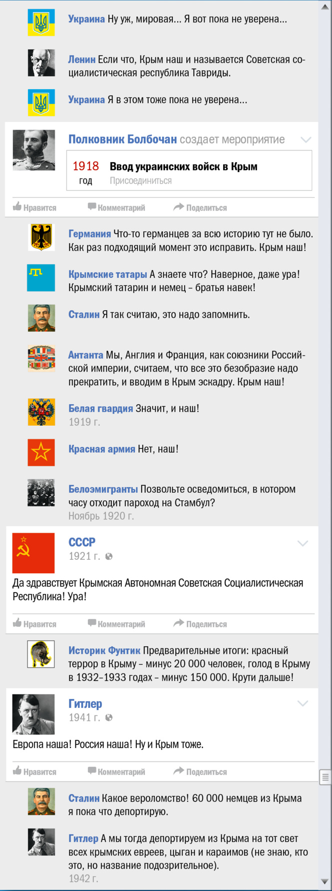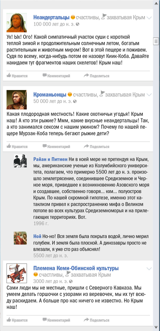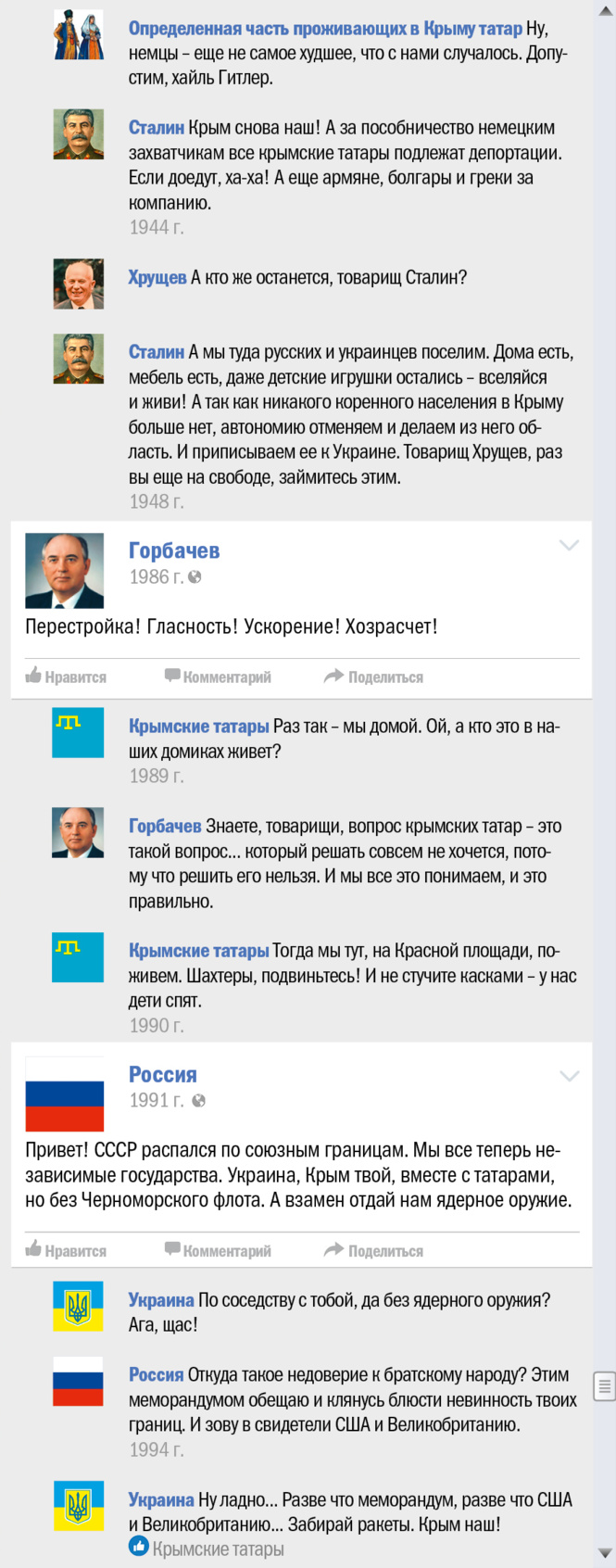 В эти грозовые дни, когда весь мир, сам не зная об этом, отмечает трехлетие присоединения (и это еще мягко сказано) Крыма к России, мы все же решили выяснить, чьей исконной территорией является многострадальный полуостров. Для чего и воспользовались проверенным форматом «как если бы это происходило в соцсети».