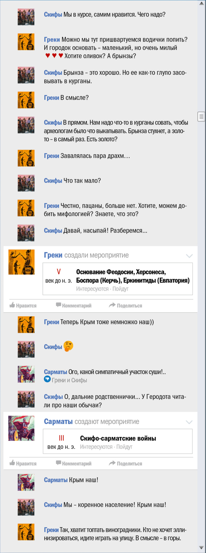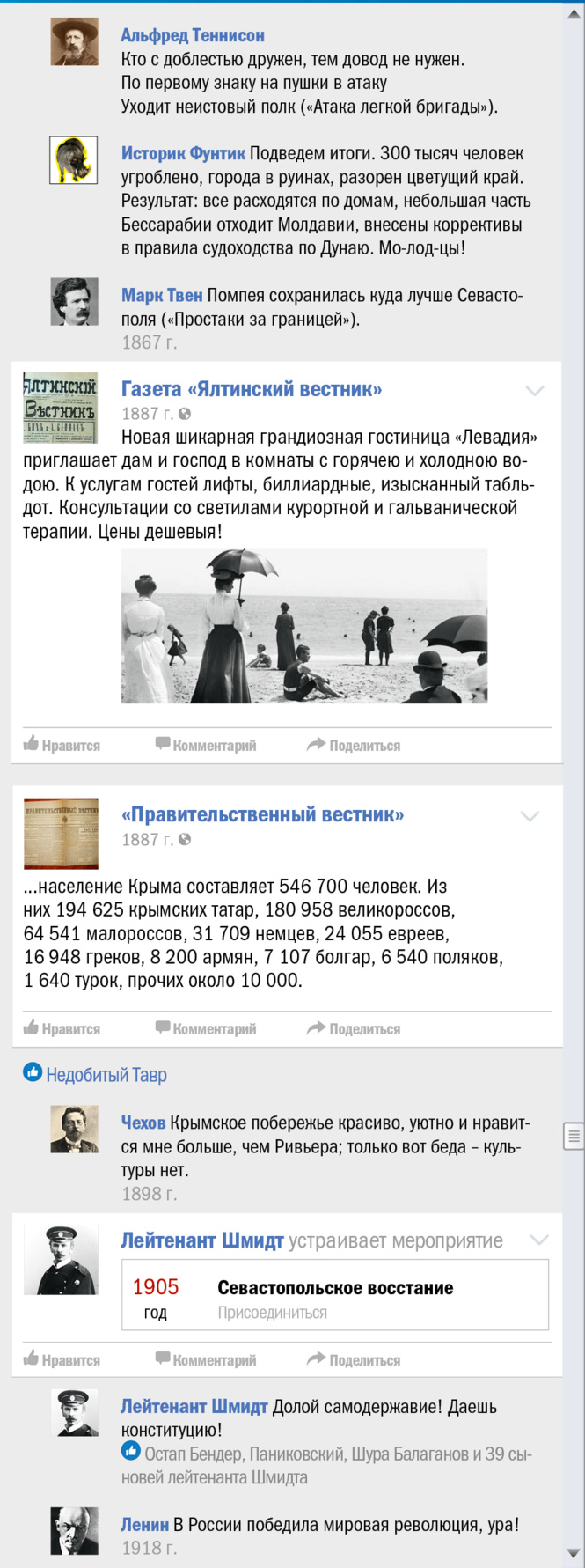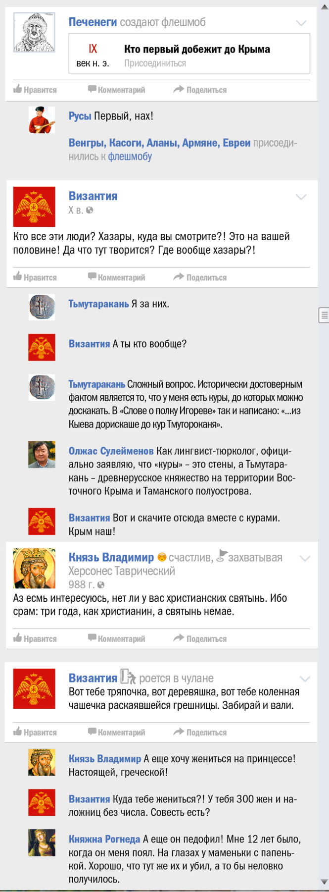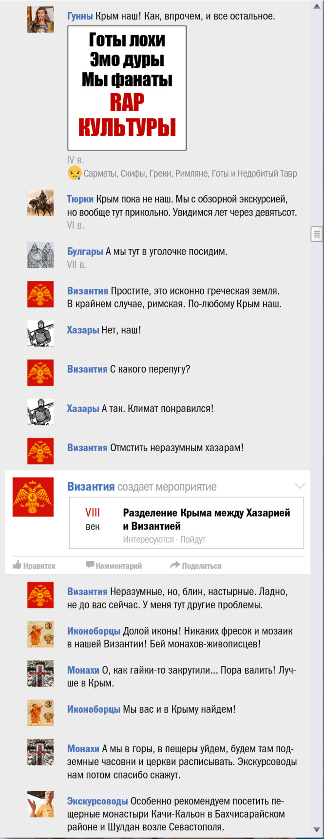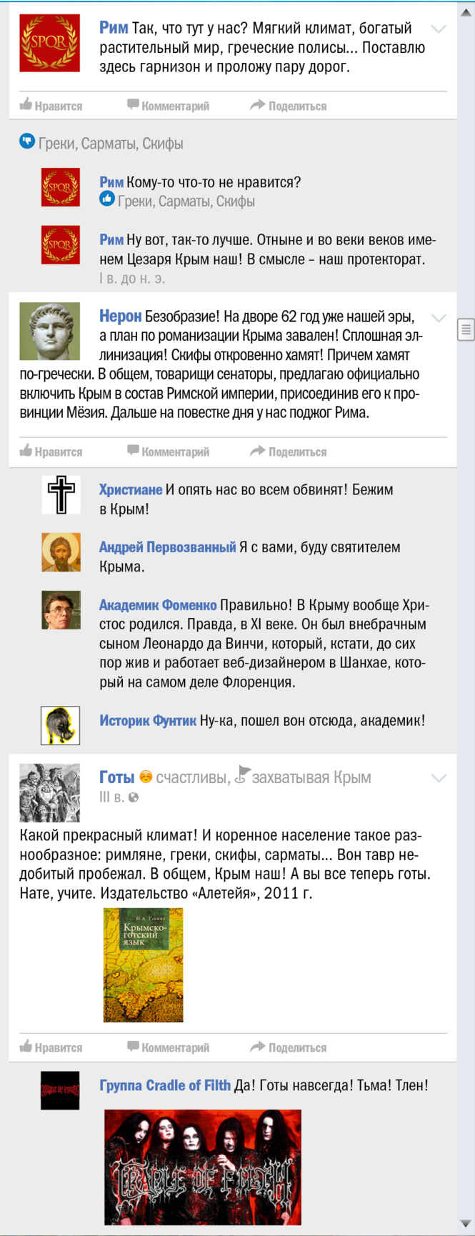 В эти грозовые дни, когда весь мир, сам не зная об этом, отмечает трехлетие присоединения (и это еще мягко сказано) Крыма к России, мы все же решили выяснить, чьей исконной территорией является многострадальный полуостров. Для чего и воспользовались проверенным форматом «как если бы это происходило в соцсети».