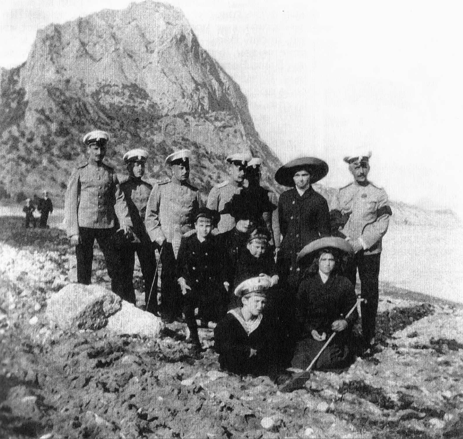Прогулка по берегу бухты Новый Свет. На фото: Императрица Александра Федоровна, цесаревич Алексей, великие княжны Ольга и Мария, дети великого герцога Эрнста Гессенского и офицеры яхты «Штандарт». 11 мая 1912
