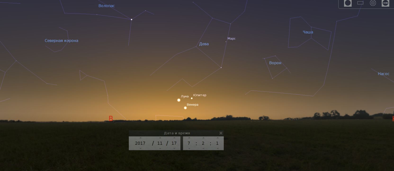 17 ноября – прохождение Луны в 4 градусах севернее Венеры – в 11:00.