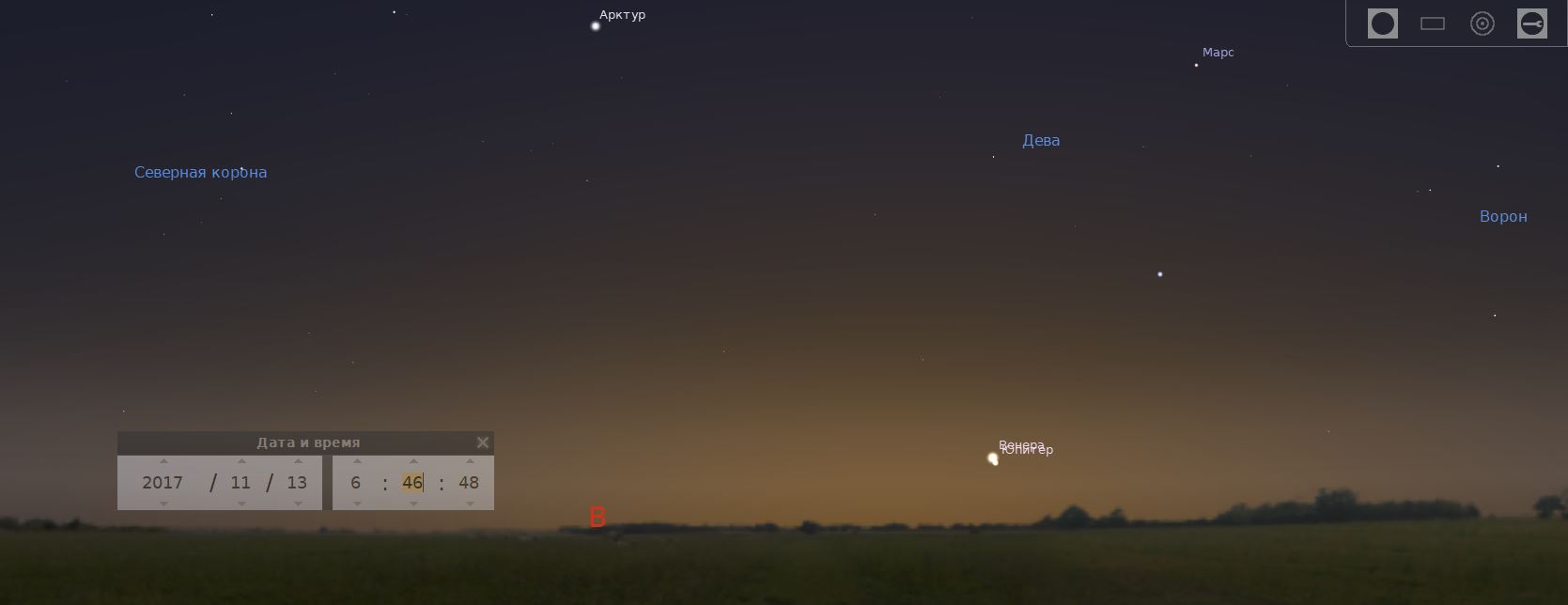 На рассвете, 13 ноября, при условии ясной погоды, в юго-восточной части небосвода можно увидеть красивое небесное явление — сближение планет Венеры и Юпитера. Расстояние между объектами будет менее 0,5 градусов. Практически, на предрассветном фоне, две планеты будут сливаться в одно яркое пятно.