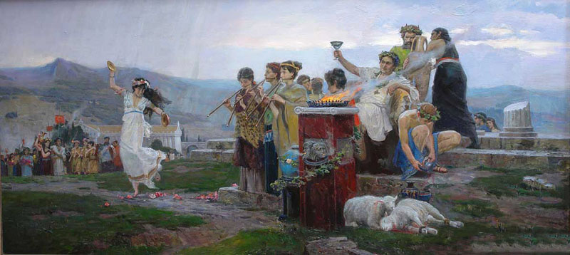 С веселой толпой украшенных венками менад и сатиров ходит веселый бог Дионис по всему свету, из страны в страну. Он идет впереди в венке из винограда с украшенным плющом тирсом в руках. Вокруг него в быстрой пляске кружатся с пением и криками молодые менады; скачут охмелевшие от вина неуклюжие сатиры с хвостами и козлиными ногами. За шествием везут на осле старика Силена, мудрого учителя Диониса. Он сильно охмелел, едва сидит на осле, опершись на лежащий около него мех с вином. Венок из плюща сполз набок на его лысой голове. Покачиваясь, едет он, добродушно улыбаясь. Молодые сатиры идут около осторожно ступающего осла и бережно поддерживают старика, чтобы он не упал. Под звуки флейт, свирелей и тимпанов шумное шествие весело двигается в горах, среди тенистых лесов, по зеленым лужайкам. Весело идет по земле Дионис-Вакх, все покоряя своей власти. Он учит людей разводить виноград и делать из его тяжелых спелых гроздей вино.