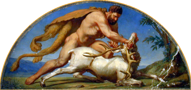 Эврисфей знал, что в Аркадии живет чудесная керинейская лань, посланная богиней Артемидой в наказание людям. Лань эта опустошала поля. Эврисфей послал Геракла поймать ее и велел ему живой доставить лань в Микены. Эта лань была необычайно красива, рога у нее были золотые, а ноги медные. Подобно ветру, носилась она по горам и долинам Аркадии, не зная никогда усталости. Целый год преследовал Геракл керинейскую лань. Она неслась через горы, через равнины, прыгала через пропасти, переплывала реки. Все дальше и дальше на север бежала лань. Не отставал от нее герой, он преследовал ее, не упуская из виду. Наконец Геракл достиг в погоне за падью крайнего севера — страны гипербореев и истоков Истра. Здесь лань остановилась. Герой хотел схватить ее, но ускользнула она и, как стрела, понеслась назад, на юг. Опять началась погоня. Гераклу удалось только в Аркадии настигнуть лань. Даже после столь долгой погони не потеряла она сил. Отчаявшись поймать лань, Геракл прибег к своим не знающим промаха стрелам. Он ранил златорогую лань стрелой в ногу, и только тогда удалось ему поймать ее. Геракл взвалил чудесную лань на плечи и хотел уже нести ее в Микены, как предстала пред ним разгневанная Артемида и сказала: