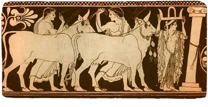 Вскоре Эврисфей дал новое поручение Гераклу. Он должен был очистить от навоза весь скотный двор Авгия, царя Элиды, сына лучезарного Гелиоса. Бог солнца дал своему сыну неисчислимые богатства. Особенно многочисленны были стада Авгия. Среди его стад было триста быков с белыми, как снег, ногами, двести быков были красные, как сидонский пурпур, двенадцать быков, посвященные богу Гелиосу, были белые, как лебеди, а один бык, отличавшийся необыкновенной красотой, сиял, подобно звезде. Геракл предложил Авгию очистить в один день весь его громадный скотный двор, если он согласится отдать ему десятую часть своих стад. Авгий согласился. Ему казалось невозможным выполнить такую работу в один день. Геракл же сломал с двух противоположных сторон стену, окружавшую скотный двор, и отвел в него воду двух рек, Алфея и Пенея. Вода этих рек в один день унесла весь навоз со скотного двора, а Геракл опять сложил стены. Когда герой пришел к Авгию требовать награды, то гордый царь не отдал ему обещанной десятой части стад, и пришлось ни с чем вернуться в Тиринф Гераклу.