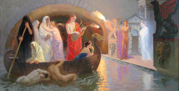 Наконец, решил Орфей спуститься в мрачное царство душ умерших, чтобы упросить владыку Аида и жену его Персефону вернуть ему жену. Через мрачную пещеру Тэнара спустился Орфей к берегам священной реки Стикса.