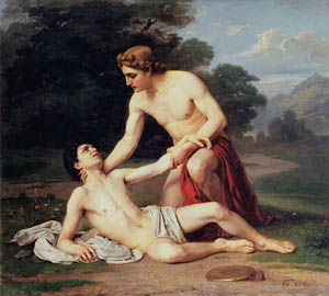 — Ты умираешь, мой милый друг! О, горе, горе! Ты погиб от моей руки! Зачем бросил я диск! О, если бы мог я искупить мою вину и вместе с тобой сойти в безрадостное царство душ умерших! Зачем я бессмертен, зачем не могу последовать за тобой!