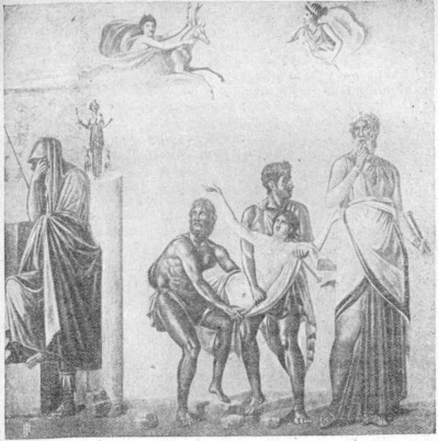 Спокойно пошла Ифигения туда, где сооружен был жертвенник в честь богини Артемиды. Прекрасная и величественная, прошла среди несметных рядов воинов Ифигения и встала около жертвенника. Заплакал Агамемнон, взглянув на свою юную дочь, и, чтобы не видеть ее смерти, закрыл голову своим широким плащом. Спокойно стояла у жертвенника Ифигения. Все хранили, по повелению глашатая Тальфибия, глубокое молчание. Вещий Калхас вынул из ножен жертвенный нож и положил его в золотую корзину. На голову девы он надел венок, как на жертву, которую ведут к алтарю. Вышел из рядов воинов Ахилл. Он взял сосуд со священной водой и жертвенную муку с солью, окропил водой Ифигению и жертвенник, посыпал мукой голову девы и громко воззвал к богине Артемиде, моля ее послать войску благополучное плавание к троянским берегам и победу над врагами. Взял Калхас в руку жертвенный нож. Все замерли. Вот занес он нож, чтобы поразить им Ифигению. Вот коснулся уже нож девы. Но не упала с предсмертным стоном у жертвенника Ифигения. Совершилось великое чудо. Богиня Артемида похитила Ифигению, и вместо нее у алтаря, обагряя его кровью, билась в предсмертных судорогах лань, сраженная ножом Калхаса. Пораженные чудом, как один человек вскрикнули все воины. Громко и радостно вскрикнул и вещий Калхас: