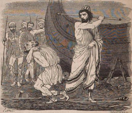 — Благородный сын Лаэрта, неужели вы все решили бежать отсюда на родину? Неужели вы оставите на радость Приаму и всем троянцам здесь прекрасную Елену? Скорее иди, убеждай всех не покидать Трои! Услыхав грозный голос богини, побежал Одиссей, сбросив свой плащ, к кораблям. Взяв у встретившегося ему Агамемнона скипетр, знак верховной власти, стал он убеждать всех, как вождей, так и простых воинов, не спускать кораблей на воду и звал всех назад на народное собрание. Ударял скипетром Одиссей тех из воинов, которые особенно шумели и спешили скорее покинуть берег Трои. Снова бросились все туда, где собирался обыкновенно народ. С громкими криками шли толпы народа, словно волны неумолчно шумящего моря, которые с громоподобным шумом бьются о скалистый берег. Наконец, опять все заняли свои места и смолкли. Только один Терсит продолжал кричать. Постоянно позволял себе Терсит смело выступать против царей. Особенно ненавидел он Одиссея и великого сына Фетиды Ахилла. Теперь пронзительно кричал Терсит и поносил Агамемнона. Он кричал, что довольно получил Агамемнон добычи и невольниц, довольно уже ему богатых выкупов за знатных троянцев, которых берут в плен простые воины. Терсит звал всех спешить скорее на родину, а Агамемнона советовал оставить под Троей одного. Пусть узнает сын Атрея, помогали ли в бою ему воины, были или нет они верными слугами. Поносил, как только мог, Терсит Агамемнона. Он упрекал его и за то, что оскорбил он Ахилла, но и Ахилла называл Терсит малодушным. Слышал этот крик Терсита и хитроумный Одиссей. Подошел он к Терситу и воскликнул грозно: