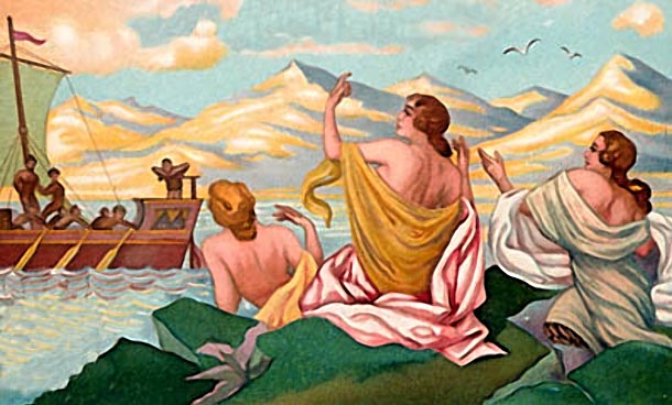 — О, плыви к нам, великий Одиссей! — так пели сирены, — к нам направь свой корабль, чтобы насладиться нашим пением. Не проплывет мимо ни один моряк, не послушав нашего сладостного пения. Насладившись им, покидает он нас, узнав многое. Все знаем мы — и что претерпели по воле богов под Троей греки, и что делается на земле.