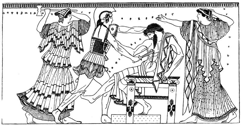 В ужасе стал собираться народ у дверей дворца, узнав о гибели Клитемнестры и Эгисфа. Ни в ком из граждан не пробудилось и капли жалости к ненавистному всеми тирану Эгисфу и коварной Клитемнестре. Открылись двери дворца, и увидали все окровавленные трупы Эгисфа и Клитемнестры, а над ними стоял Орест. Чувствовал себя правым Орест, совершив это убийство: ведь он исполнял волю Аполлона, мстя за смерть отца. Но вдруг перед Орестом появились неумолимые богини мщения Эринии. Вокруг их голов извивались ядовитые змеи, очи их сверкали страшным гневом. Затрепетал Орест при виде их. Он чувствовал, как понемногу омрачается его рассудок. Покинул он дворец и, гонимый Эриниями, пошел к святилищу Аполлона в Дельфах надеясь, что защитит его бог, волю которого он исполнил.