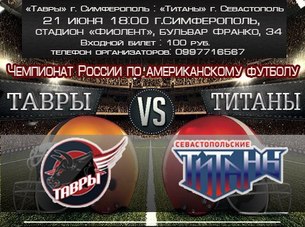 21 июня в Симферополе состоится матч по американскому футболу между симферопольскими «Таврами» и «Севастопольскими титанами». Об этом сообщили в команде «Тавры».